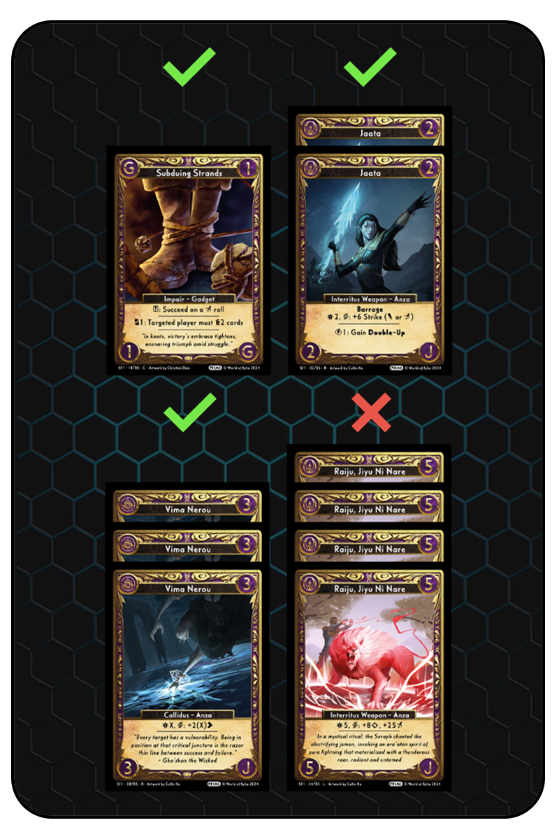 For instance, in the example provided, all stacks meet the required amount to play except for Raiju. If you only have 4 Raiju cards in your hand, you must wait until you draw a 5th matching card before it can enter your Battlefield.