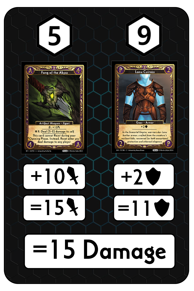 Once cards are on the field, they function as a single entity. Turning a stack will cause all cards within that stack to turn as well. In addition to serving as the cost, stack size has various other gameplay uses. The size of a stack can also be considered the durability of that card, as some effects can break cards.