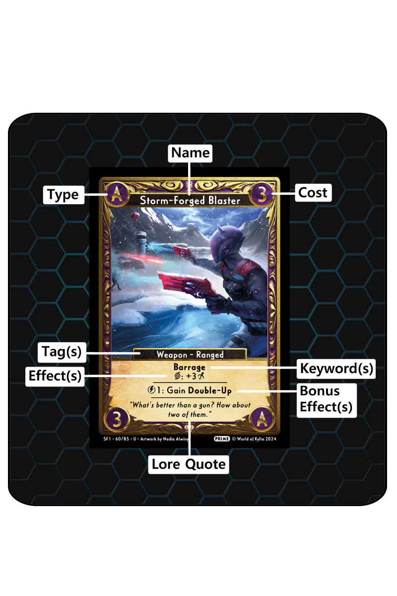 Effects – This is the standard effect of the card. Cards that have a symbol followed by a “:” indicate that the ability is a paid effect. This can be through resources, turning the card sideways, or a condition