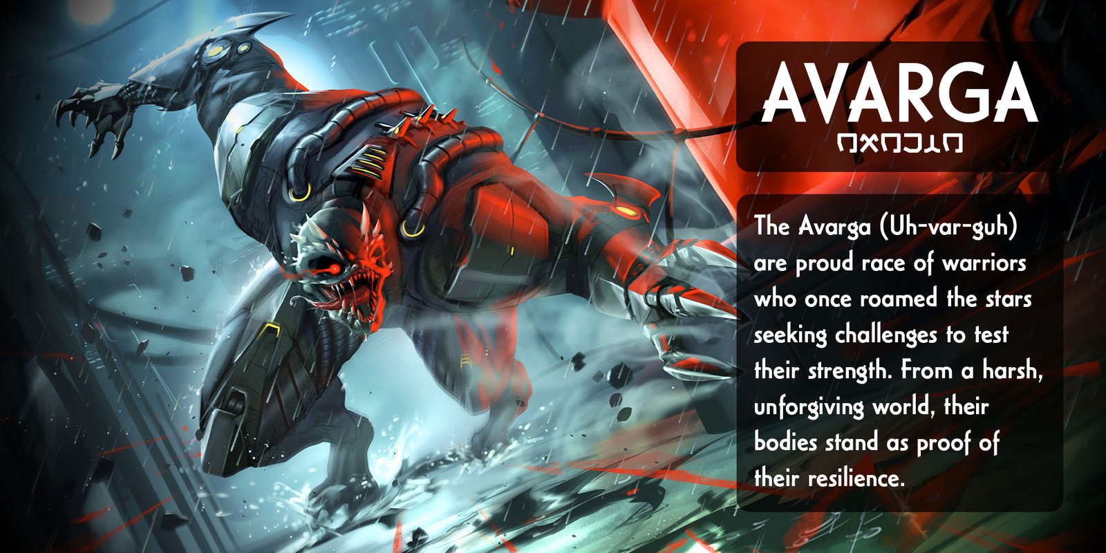 The avarga are a prideful species of humanoid warriors that used to traverse the stars seeking challenges to prove their strength. Originating from a harsh unforgiving world, avargan bodies have become physical testaments to their capability to survive.