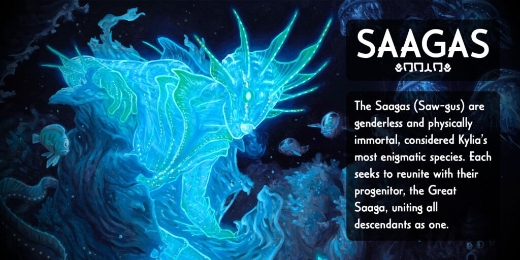 A genderless species that reproduces asexually and is physically immortal, the saagas are by far the most unique and enigmatic of the sentient species on Kylia. The saagas believe that they are all descendants of a single progenitor, the Great Saaga. The ultimate goal of a saagas is to find a means by which to reunite themselves with their progenitor.